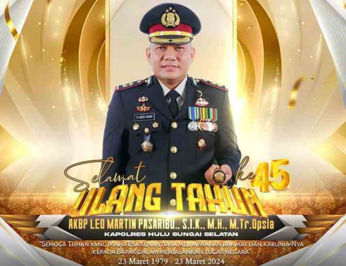 Salah seorang pewarta Nando dari jelajalahkaliman news.com memberikan doa dan ucapan selamat di hari kelahiran orang nomor satu di Polres HSS AKBP Leo Martin Pasaribu ke-45 tahun.“Mudah mudahan Tuhan Yang Maha Kuasa senantiasa memberikan keberkahan, lindungan, kesehatan, keselamatan, dan kesuksesan dalam karirnya, Sabtu (23/3/2024)
