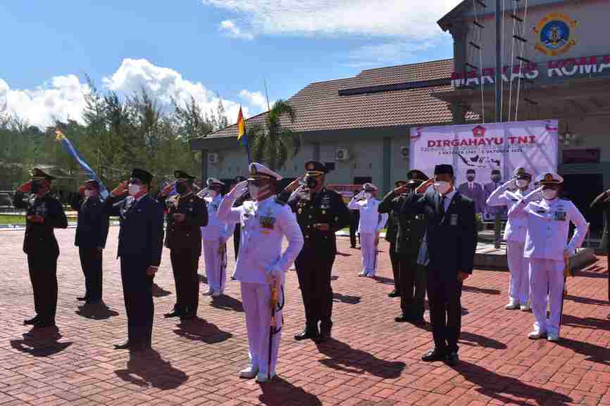 Kotabaru BARITO – Upacara Peringatan HUT TNI ke-76 diperingati dengan pelaksanaan Upacara oleh Pangkalan TNI-AL Kotabaru dan Kodim 1004 Kotabaru yang dilaksanakan secara Virtual di Lapangan apel Mako Lanal Kotabaru. Selasa (5/10)