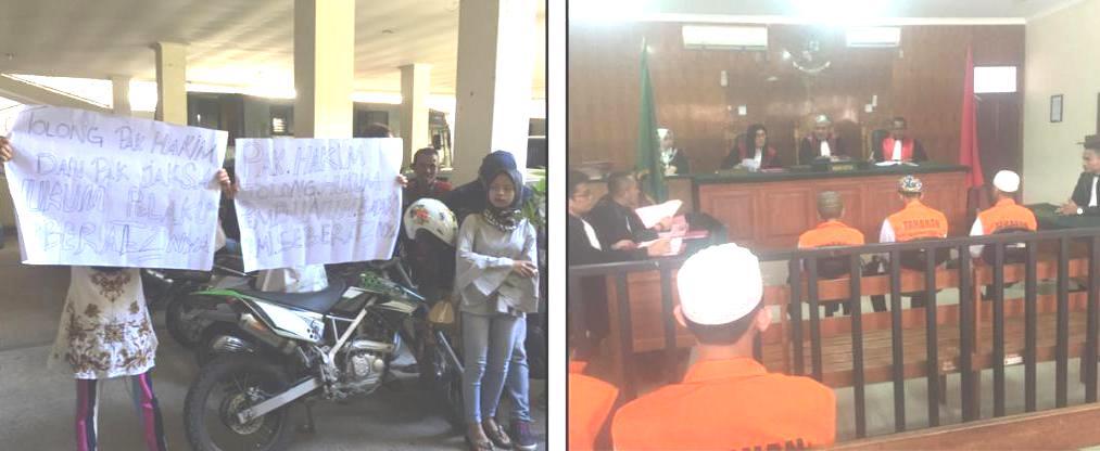 Di halaman parkir dalam, mereka membentangkan poster dari karton putih yang berisi tulisan agar jaksa dan hakim menghukum ketiga terdakwa (satu terdakwa anak sudah divonis 4 tahun) dihukum seberat-beratnya.