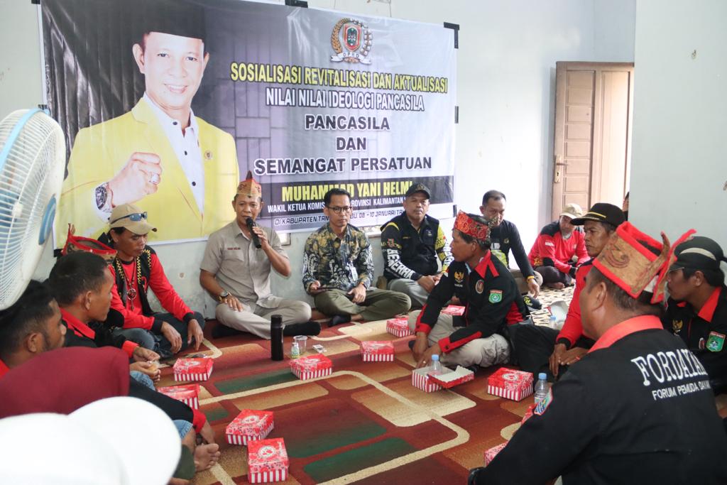 Pesan itu disampaikan Wakil Ketua Komisi II DPRD Provinsi Kalimantan Selatan (Kalsel), Muhammad Yani Helmi karib disapa Paman Yani saat menggelar Sosialisasi Revitalisasi dan Aktualisasi Nilai-Nilai Ideologi Pancasila kepada Forum Pemuda Dayak (Fordayak) Kabupaten Tanah Bumbu (Tanbu) di Desa Sepunggur, Kecamatan Kusan Tengah, Kabupaten Tanbu, Selasa (9/1/2024).