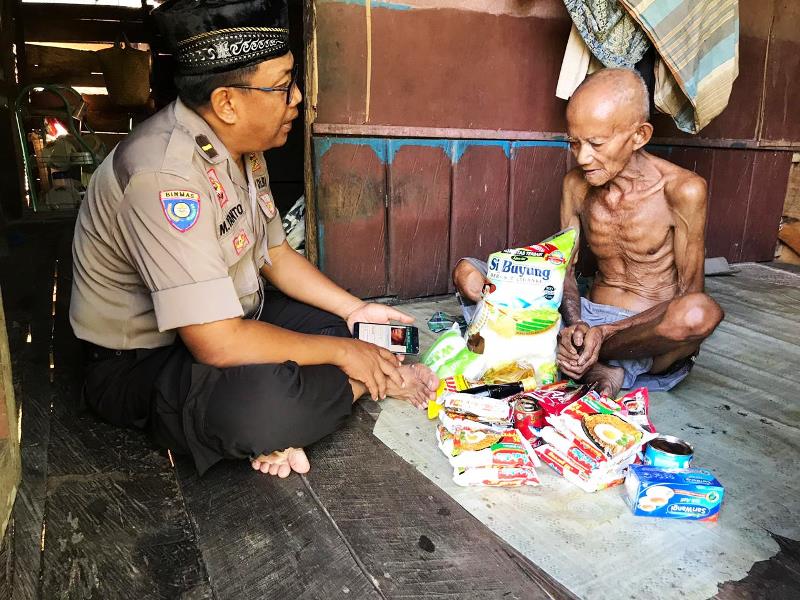 IPDA Mujiyanto saat berkunjung ke salah satu warga sekaligus memberikan bantuan ( foto ist).