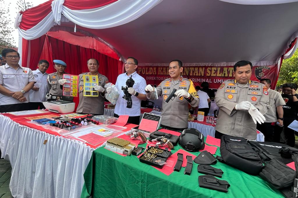 Kapolda Kalsel Irjen Pol Andi Rian R Djajadi mengatakan, turut diamankan senjata api jenis pistol CZ PS 10-C caliber 9 mm.”Setelah dilakukan pengembangan, jajaran Ditreskrimum Polda Kalsel kembali mengamankan pucuk senjata senjata api dan air soft gun,” kata Irjen Pol Andi Rian R Djajadi didampingi Karo SDM Kombes Pol Muhammad Arif Sugiarto, Kabid Humas Kombes Pol Mochammad Rifa’i dan Dirkrimum Kombes Pol Erick Frendriz