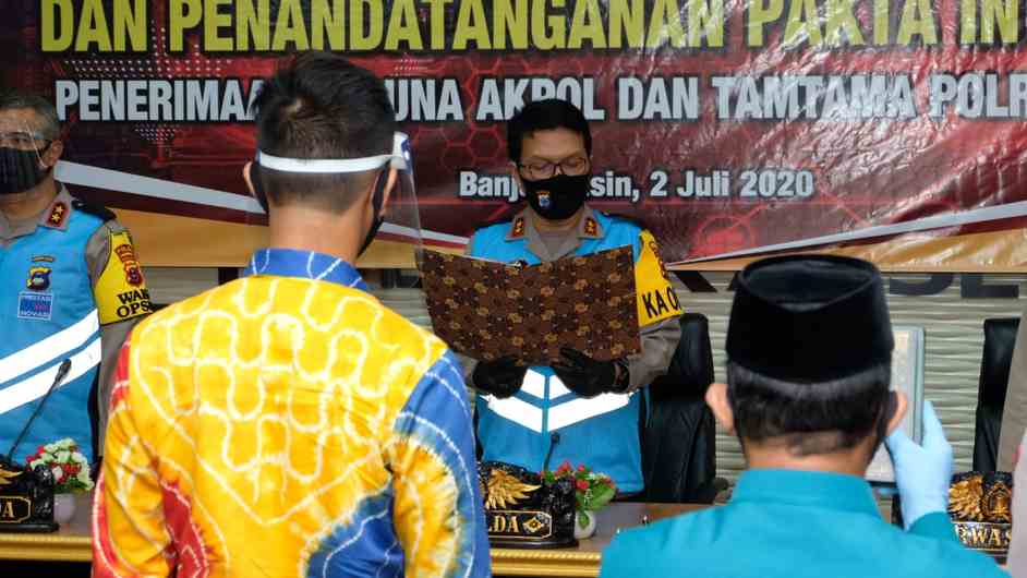 Dalam mewujudkan Sumber Daya Manusia (SDM) unggul yang bersih, transparan, akuntabel dan humanis (BETAH), Polda Kalsel menggelar Pengambilan Sumpah dan Penandatanganan Pakta Integritas Panitia, Peserta dan Orang tua Peserta Calon Anggota Polri Penerimaan Terpadu Taruna Akpol dan Tamtama Polri TA.2020.