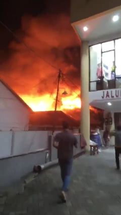Kebakaran yang terjadi di tengah kota itu nampak api berkobar cukup besar. Hal itu mengundang para relawan Barisan Pemadam Kebakaran (BPK) langsung berdatangan guna mengeroyok si jao merah.