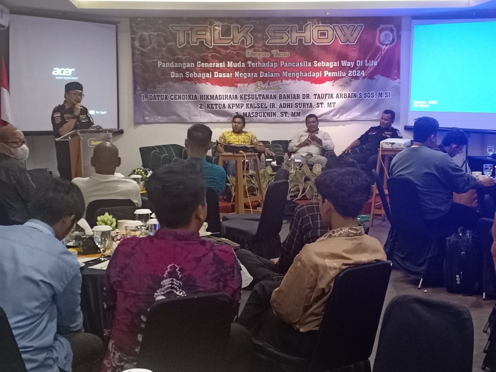 Banjarmasin, BARITO – Menjelang Pemilu 2024, Komando Pejuang Merah Putih (KPMP) memberikan edukasi kepada pemuda untuk memahami pancasila sebagai dasar negara. “Jadi edukasi kita, yakni diskusi dan hasilnya dapat ditularkan ke generasi muda. Pemuda memiliki kontribusi besar di Pemilu 2024,” ucap Ketua KPMP Kalsel Ir Adhi Surya Said MT, dalam Talk Show “Pandangan Generasi Muda Terhadap Pancasila Sebagai Way Of Life dan Sebagai Dasar Negara Menghadapi Pemilu 2024” di Hotel Summer Banjarmasin, Minggu (25/9/2022).