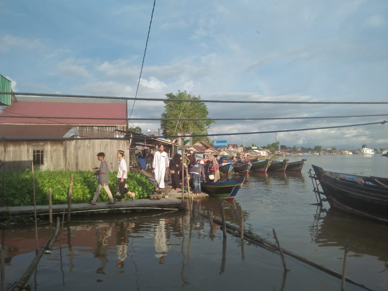 Banjarmasun. BARITOPOST.CO.ID – Jamaah Haul ke 4 Guru Zuhdianoor yang berdatangan menggunakan klotok di Sungai Martapura berlabuh ke Titian Lanting Jamban sebagai “dermaga” darurat. Tepatnya di bantaran di Jalan Panglima Batur Gang Gang Gusti Galuh Kelurahan Surgi Mufti Banjarmasin Utara, Kamis (7/3/2024) sore.
