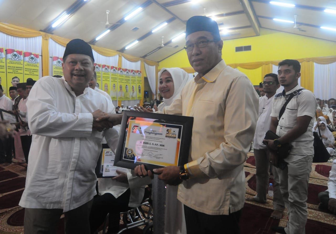 SUARA TERBANYAK-H Rusli, SAP, MM menerima penghargaan peraih suara terbanyak pada Pileg 2019 yang diserahkan oleh Korwil Pemenangan Golkar Kalimantan H Gusti Iskandar Sukma Alamsyah.(foto : iman satria-brt)
