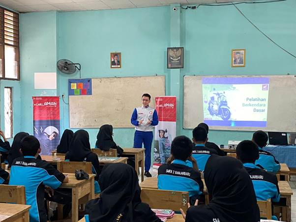 Safety Riding, mengacu UU RI Nomor 22 Tahun 2009 tentang lalu lintas dan angkutan jalan. Kesempatan tersebut, juga diberikan promo berupa service kunjung di SMKN 2 Banjarbaru. Semua disambut meriah dewan guru dan staff yang turut menjadi undangan,” imbuhnya.