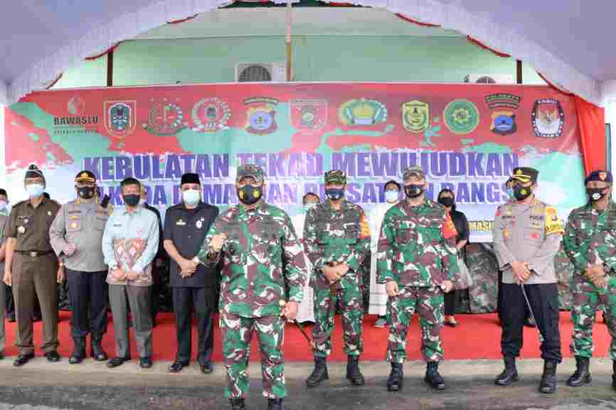 Banjarnasin,. BARITO – Panglima Kodam (Pangdam) VI/Mulawarman Mayjen TNI Heri Wiranto didampingi Danrem 101/Antasari Brigjen TNI Firmansyah dan Ketua DPRD Prov Kalsel H. Supian HK menghadiri acara Deklarasi Tekad Mewujudkan Pilkada yang bertempat di Makodim 1007/Banjarmasin, Kamis. (26/11/2020).