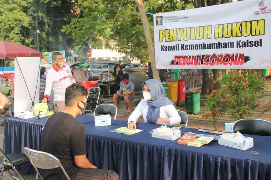 Banjarmasin, BARITO – Kantor Wilayah (Kanwil) Kementerian Hukum dan Hak Asasi Manusia (Humham) Kalimantan Selatan (Kalsel) menggelar kegiatan Kumham Peduli, Kumham Berbagi melalui pelaksanaan dua kegiatan secara simultan, Minggu (25/10/2020) pagi. Bertempat di Siring 0 KM Banjarmasin, selain pembagian masker secara cuma-cuma kepada masyarakat, mereka juga melayani Konsultasi Hukum Gratis.