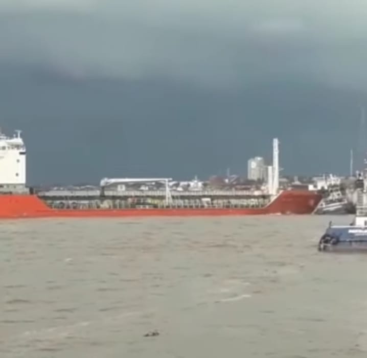Banjarmasin, BARITO – WARGA pesisir Sungai Barito yang sebagian sedang melakukan aktivitasnya Minggu (20/12/2020) sore mendadak panik menyusul suara benturan keras berkali kali disusul runtuhnya material rumah mereka. Benturan keras itu berasal sebuah Kapal Tanker, MT Ocean River yang diduga lepas kendali di Sungai Barito kawasan Dermaga Banjar Raya dan menghantam sejumlah tugboat yang sedang tambat dan memporak porandakan sejumlah rumah di pinggir sungai.