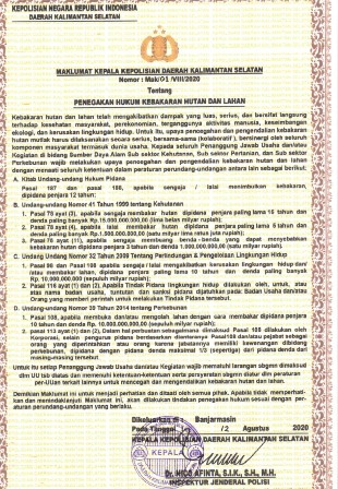 Maklumat Kapolda Kalsel itu mengatur 5 (Lima) hal tentang larangan pembakaran hutan dan lahan di Kalsel, hingga sanksi yang akan diberikan kepada pelaku. Salah satu poin menekankan proses hukum yang tegas bagi pembakar lahan, baik personal maupun perusahaan atau korporasi.