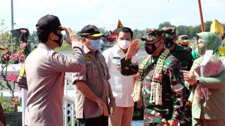 Kapolda Kalsel Irjen Pol. Dr. Nico Afinta, S.I.K., S.H., M.H. bersama Forum Koordinasi Pimpinan Daerah (Forkopimda) menyambut kedatangan Pangdam VI/Mulawarman Mayjen TNI Heri Wiranto, S.E., M.M., S.Tr (Han) di Bandara Syamsudin Noor Banjarbaru, Rabu (9/9/2020) pukul 10.00 Wita.