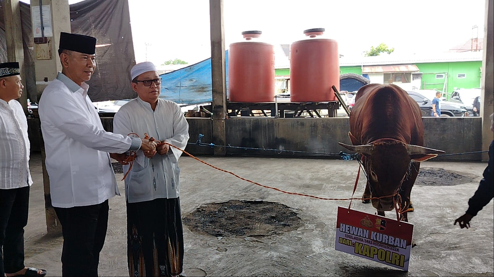 Sementara itu, di tempat berbeda, Wakapolda Kalsel Brigjen Rosyanto Yudha didampingi Kapolres Banjar AKBP Irfan Hariyat menyerahkan satu ekor sapi kurban jenis Limousine seberat 600 kg dari Kapolda Kalsel kepada H. Toni, selaku Ketua Dapur Umum Gang Taufik.