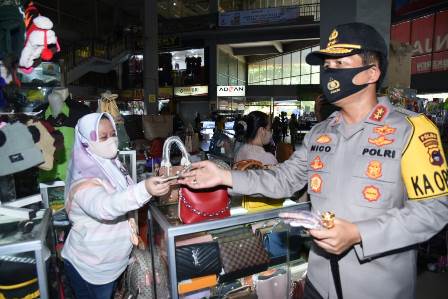 Operasi Yustisi penegakan protokol kesehatan di Kota Banjarmasin diwarnai dengan pembagian masker kepada warga masyarakat yang ada di Ramayana Sentral Antasari Banjarmasin, Kamis (17/9/2020) pukul 12.30 Wita.