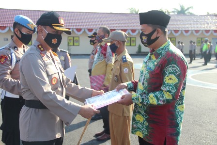 Kapolres Batola AKBP Lalu Moh Syahir Arif pada saat apel meemberikan piagam penghargaan kepada juara umum Kampung tangguh Se- Kab. Batola bertempat di Lapangan Apel Polres Batola, Kamis (30/7/2020).