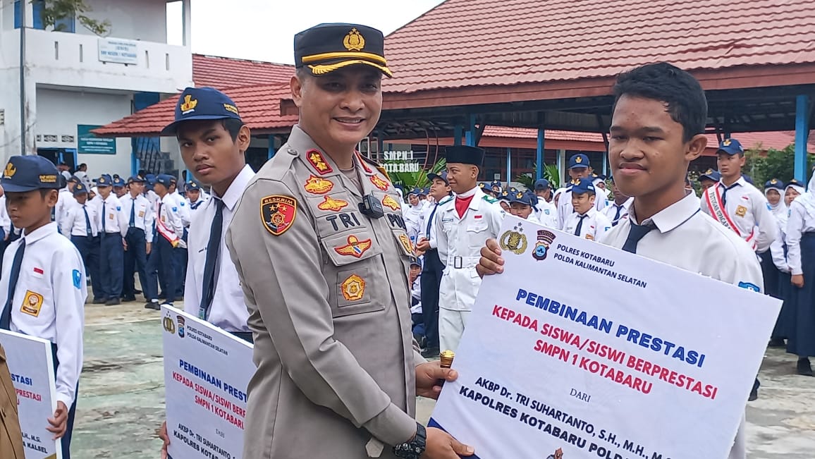 Kapolres Kotabaru AKBP. Tri Suhartanto tidak hanya memberikan motivasi, tetapi juga memberikan bantuan pembinaan kepada 3 siswa berprestasi namun berasal dari keluarga kurang mampu.