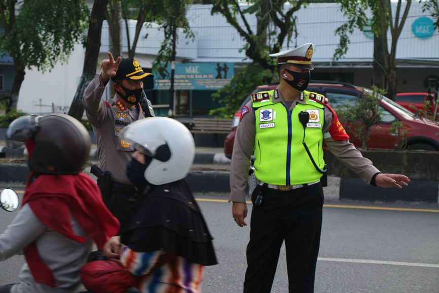 Banjarmasin, BARITO – Usai apel pagi Kapolresta Banjarmasin Kombes Pol Rachmat Hendrawan turun langsung ke jalan depan mapolresta, guna mensosialisasikan Lajur Kiri atau Kanalisasi, Senin (6/7/2020). Jalur khusus itu untuk sepeda motor akan diuji coba di sepanjang Jalan Akhmad Yani