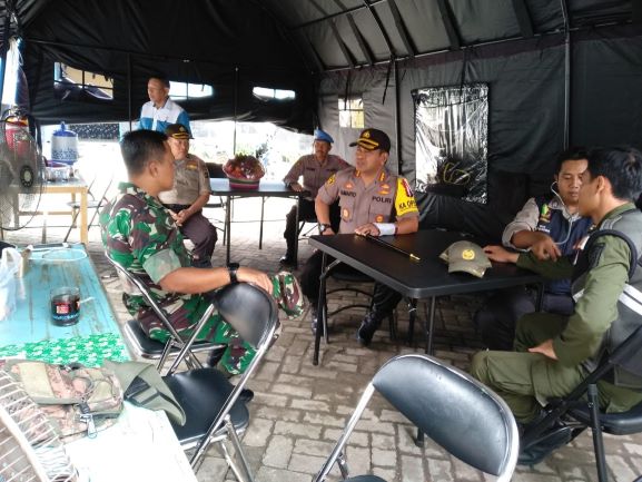 Di Kecamatan Banjarmasin Selatan, Jalan Tembus Mantuil, guna memberikan semangat kepada ratusan anggota yang bertugas di semua kecamatan, Kapolresta Banjarmasin Kombes Pol Sumarto bersama Komandan Kodim 1007 Banjarmasin, Letkol Inf Nopid Arif S memeriksa pos jaga di pintu masuk Kantor Kecamatan Banjarmasin Selatan, Rabu (24/4/2019) siang