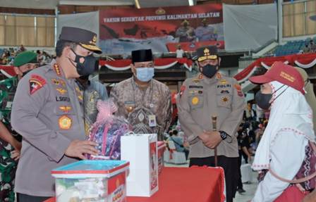Banjarmasin, BARITO – Gerai Vaksinasi Presisi secara serentak dilakukan Polda Kalsel dan jajaran di wilayah, di Banjarmasin sendiri vaksinasi terpusat di Gedung Sultan Suriansyah dengan target 3.000 dosis vaksin, sementara target keseluruhan di Kalsel sebanyak 21.000 dosis vaksin.