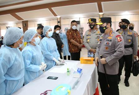 Polda Kalsel, Jakarta – Kapolri Jenderal Polisi Listyo Sigit Prabowo meninjau vaksinasi massal COVID-19 di Mapolda Sulawesi Utara hari ini, Kamis, 1 April 2021. Vaksinasi ini diikuti personel Polri dan masyarakat sekitar.