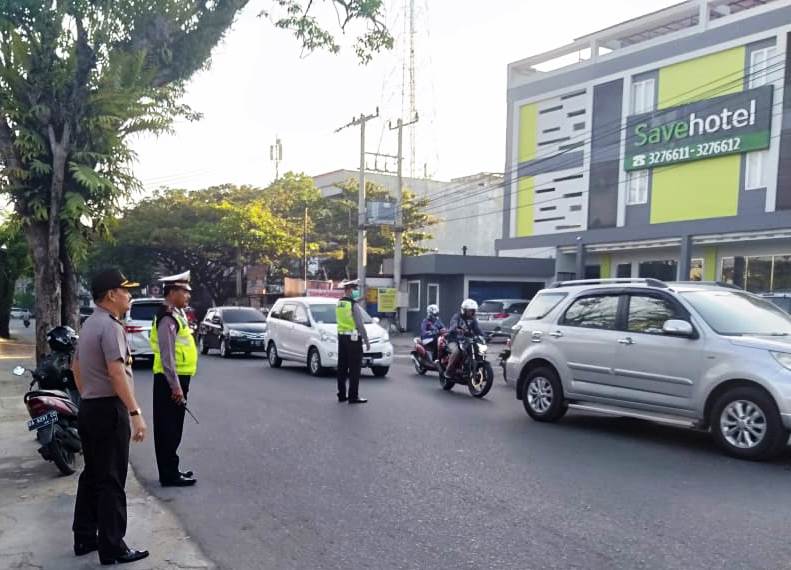 Banjarmasin, BARITO- Guna memberikan rasa aman pada pengendara lalu lintas pada jam-jam padat di wilayah Polsek Banjarmasin Timur, Selasa (16/7/2019) pagi. Kapolsek menyebarkan anggotanya di titik rawan dan kemacetan.