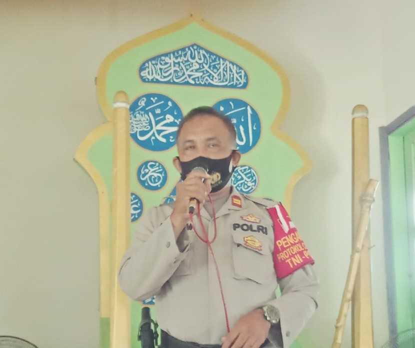 Kapolsek Barambai IPTU H. A. Halim dan Kanit Binmas Polsek Barambai Bripka Hery.O.SH di Mesjid Miftahul Jannah pada saat jum’atan di kolam kiri Kecamatan Barambai Kab Batola memberikan himbauan tentang protokol kesehatan Covid 19, tentang kebakaran Hutan dan lahan, pengamanan Pilkada serentak tanggal 9 Desember tahun 2020.