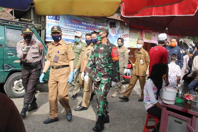 Polres Hulu Sungai Tengah Polda Kalsel, Kapolsek Batang Alai Selatan Ipda Erikson, Danramil 1002-01/Birayang bersama Forkopimca Batang Alai Selatan mendampingi Bupati Hulu Sungai Tengah H.A.Chairansyah pantau pelaksanaan pendisplinan protokol kesehatan di pasar mingguan Birayang.Senin (29/06/2020).