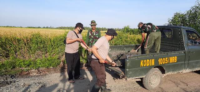 Kalimantan Selatan – Batola, Kapolsek Tabunganen AKP Lukmann simbolon, SH beserta Satgas TMMD Ke-108 melaksanakan kegiatan Kurve bersama untuk meratakan badan jalan dengan batu coral di lokasi TMMD Ke- 108 di Desa Sei Telan Besar Kec Tabunganen Kab Batola Sabtu, 25/7/20