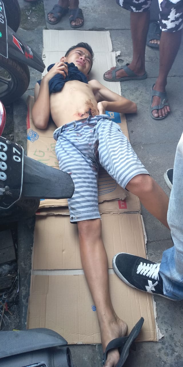 Seorang remaja bernama Jerry Ramadhani (14) mengalami luka tusuk di samping perut sebelah kanan, Selasa (18/6) siang sekitar pukul 14.30 Wita. Namun remaja itu terlihat masih berdiri dan sambil bersandar di salah satu pedagang baju di Pasar Baru Pasar Harum Manis Belakang Kelurahan Kertak Baru Ilir Banjarmasin Tengah.
