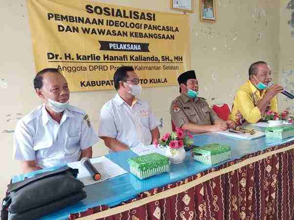 Anjir Pasar, BARITO – Anggota DPRD Provinsi Kalimantan Selatan Dr H Karlie Hanafi Kalianda, SH, MH menyelenggarakan kegiatan Sosialisasi Pembinaan Ideologi Pancasila dan Wawasan Kebangsaan di Kecamatan Anjir Pasar Kabupaten Barito Kuala, Rabu (19/1/2022).