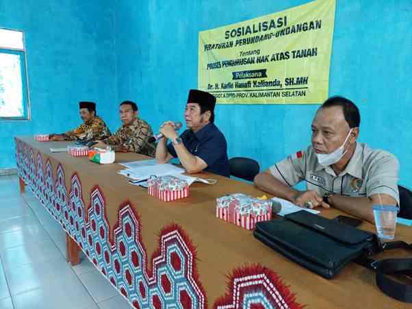 Demikian disampaikan anggota DPRD Provinsi Kalimantan Selatan Dr H Karlie Hanafi Kalianda, SH, MH saat melaksanakan kegiatan Sosialisasi/Penyebarluasan Peraturan Perundang-undangan/PP Nomor 24 Tahun 1997 tentang Pendaftaran Tanah di Desa Sungai Sahurai Kecamatan Rantau Badauh Kabupaten Barito Kuala, Kamis (23/12/2021).
