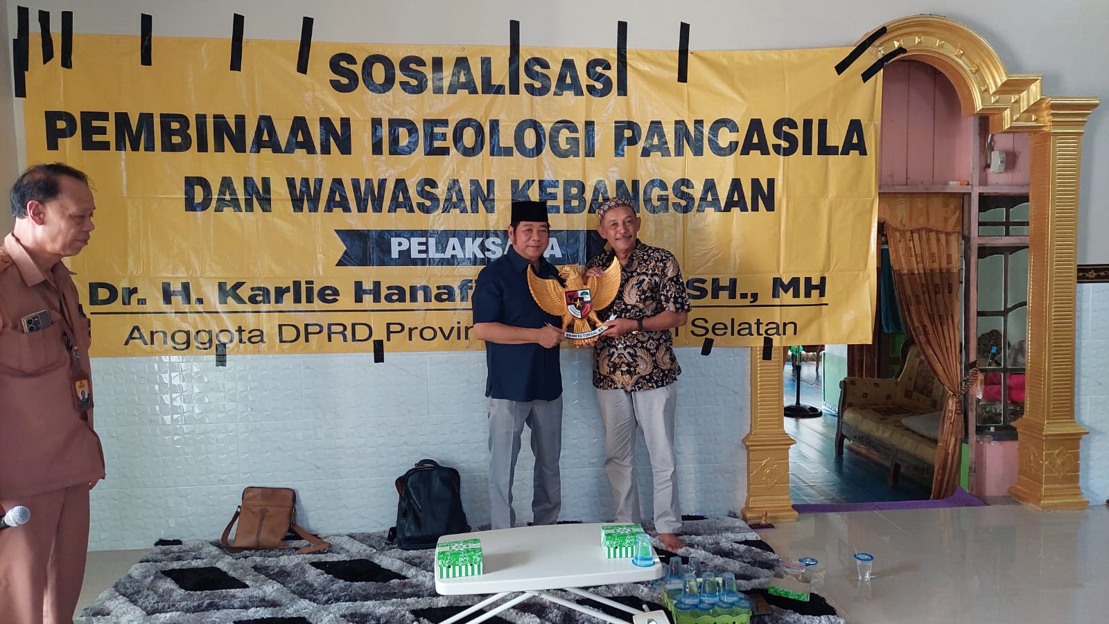 “Pancasila menyatukan perbedaan suku, ras, etnis, agama, budaya, dan geografis dalam satu titik dan membangun kebhinekaan pada masing-masing sila,” tambah Karlie Hanafi dalam kegiatan sosialisasi yang dihadiri Kepala Desa setempat, Sayuti, para tokoh masyarakat dan agama, para ketua RT, perwakilan TP PKK, aparat desa serta sejumlah anggota masyarakat lainnya.