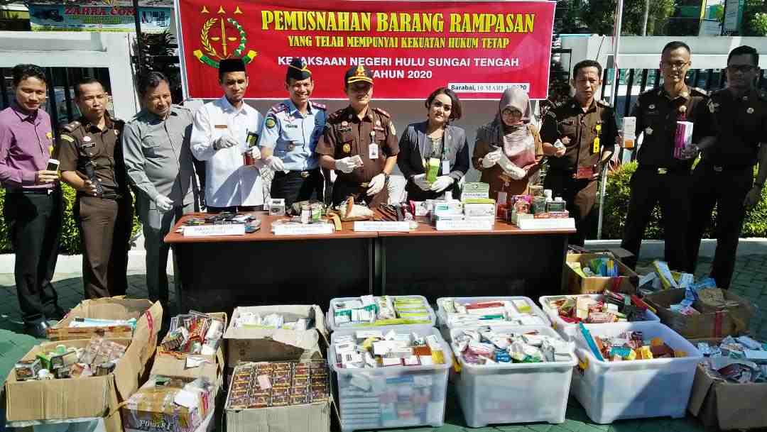 Barabai, BARITO – Kejaksaan Negeri (Kejari) Hulu Sungai Tengah memusnahkan barang bukti kasus tindak pidana yang berkaitan dengan tindak pidana umum di halaman kantor setempat , Selasa (10/3). Barbuk yang dimuskanhkan jenis sabu-sabu sebanyak 28 paket, 104 butir obat tanpa merk, handphone 12 buah, 56 butir obat warna putih bertuliskan ISD 5 dan INF, 12 macam obat yang tidak memiliki izin edar, 4 macam kosmetik yang tidak memiliki izin edar, 83 macam obat tradisional yang juga tak memiliki izin edar, 178 macam obat keras daftar G dan 10 buah senjata tajam.