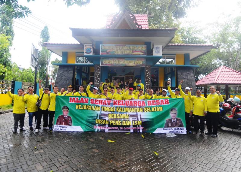 NASI BUNGKUS– Kajati Kalsel dan wartawan serta LSM foto bersama usai memberikan 1000 nasi bungkus dalam rangka kegiatan sosial Jalan Santai di Jalan AS Musafa depan Taman Lalu Lintas Banjarmasin Tengah, Minggu (13/1/2019) pagi. (foto:iman satria)