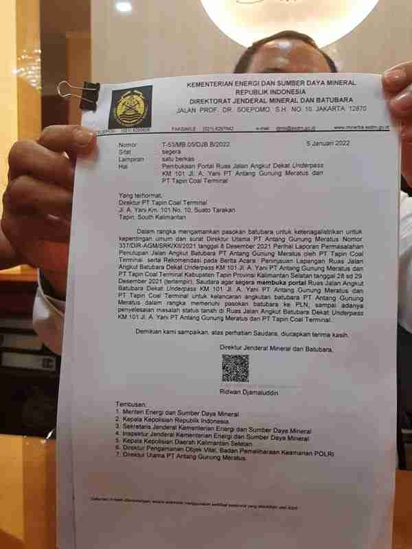 Permintaan tersebut tertuang dalam Surat Nomor : T-53/MB.05/DJB.B/2022 tentang Pembukaan Portal Ruas Jalan Angkut Dekat Underprass Km101 Tapin yang ditandatangani Direktur Jenderal Minerba dan Batubara Ridwan Djamaluddin tertanggal 5 Januari 2022 yang ditujukan kepada Direktur PT TCT.