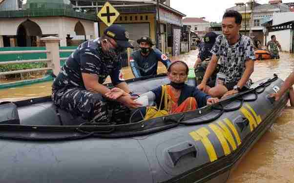 Mengerahkan prajurit dan tenaga medis, kendaraan dinas, sekoci karet, motor tempel, dayung, swempest serta peralatan pendukung lainnya, prajurit TNI AL turut mengevakusi warga yang terjebak banjir.