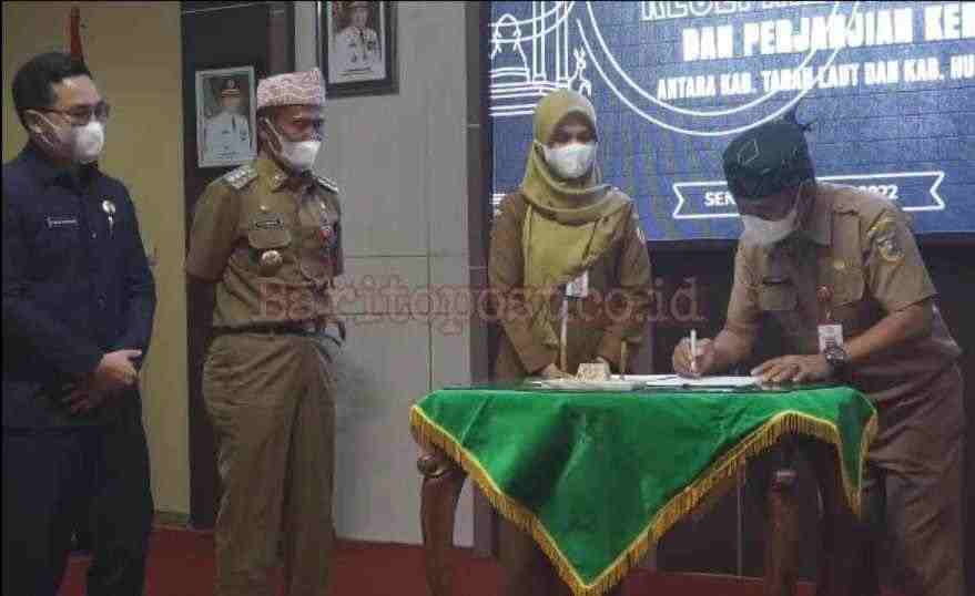 Pelaihari,BARITO – Pemerintah Kabupaten Hulu Sungai Tengah (HST) dengan ibukotanya Barabai, menjalin kerjasama bidang TI bersama Pemerintah Kabupaten Tanah Laut (Tala). Nota kerjasama ditandatangani Buptai HST H Aulia Oktafiandi dan Bupati Tala H Sukamta yang diteruskan penandatanganan oleh Kepala Dinas Komunikasi dan Informatika (Diskominfo) masing-masing kabupaten Senin, (31/1/22) di gedung Sarantang Saruntung Pelaihari Kabupaten Tanah Laut Kalsel.