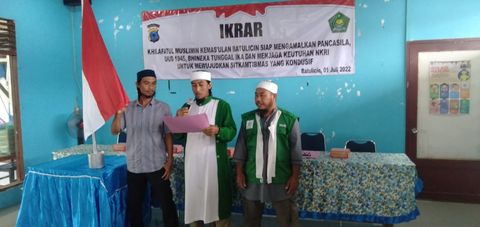 Tanah Bumbu, BARITO – Khilafatul Muslimin Kabupaten Tanah Bumbu berikrar selalu menjunjung tinggi Negara Kesatuan Republik Indonesia (NKRI) dan menjaga ideologi Pancasila, Jumat (1/8/7) di Aula Kelurahan Batulicin.