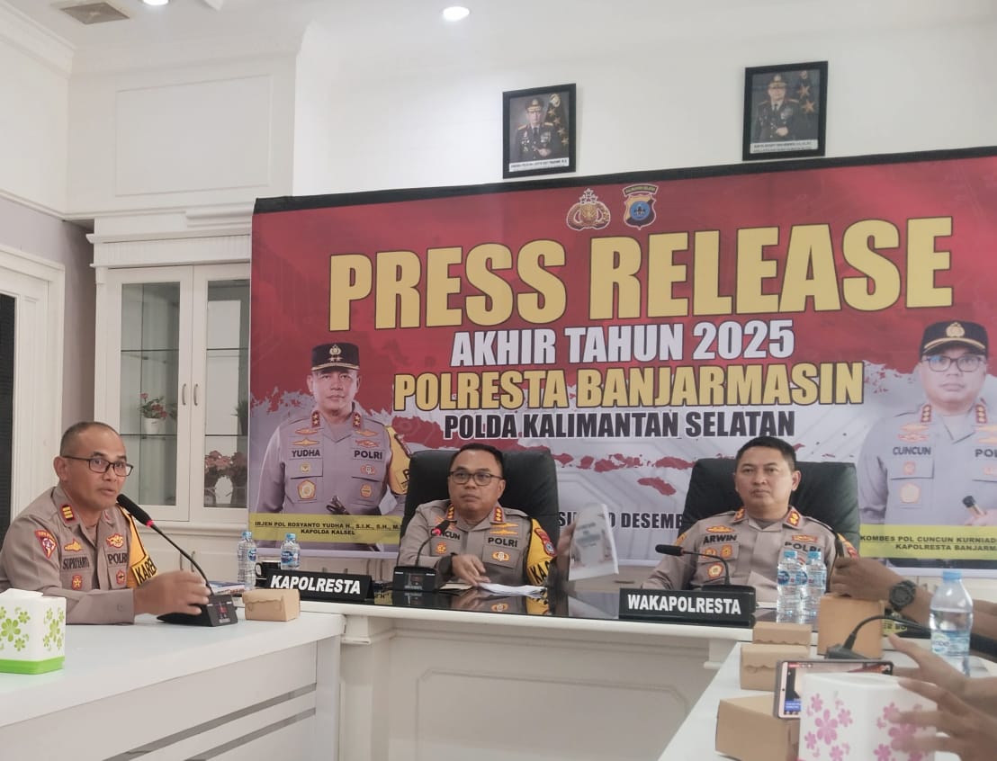 Hal tersebut disampaikan dalam Press Release Akhir Tahun 2025 yang dipimpin langsung Kapolresta Banjarmasin Kombes Pol Cuncun Kurniadi, didampingi Wakapolresta AKBP Arwin Amrih Wientama serta jajaran Pejabat Utama Polresta Banjarmasin, belum lama tadi.