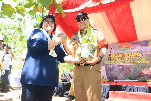 “KLHK pasti dan akan terus mendukung Revolusi Hijau. Beberapa diantara konsepnya sedanf kita rangkum, kita ramu untuk sedapatnya kita kembangkan secara nasional. Kita sedang berupaya untuk itu,” ujar Siti Nurbaya pada kegiatan Serah Terima Tanaman Hutan Kota dari KLHK kepada Pemprov Kalsel di Miniatur Hutan Hujan Tropika di kawasan komplek perkantoran, Selasa(30/7).