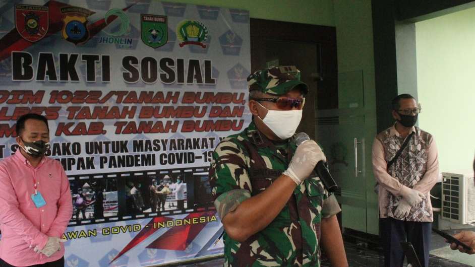 Komandan Kodim 1022/TNB Letkol Czi Bintarto Joko Yulianto SIP, Jum’at (17/4) dihalamn Kantor Kodim KM 4.5 menyerahkan kembali ke Pemerintah Daerah, secara simbolis yang diterima langsung oleh Bupati Tanbu H. Sudiaan untuk dibagikan kemasyarakat yang terkena dampak virus tersebut.