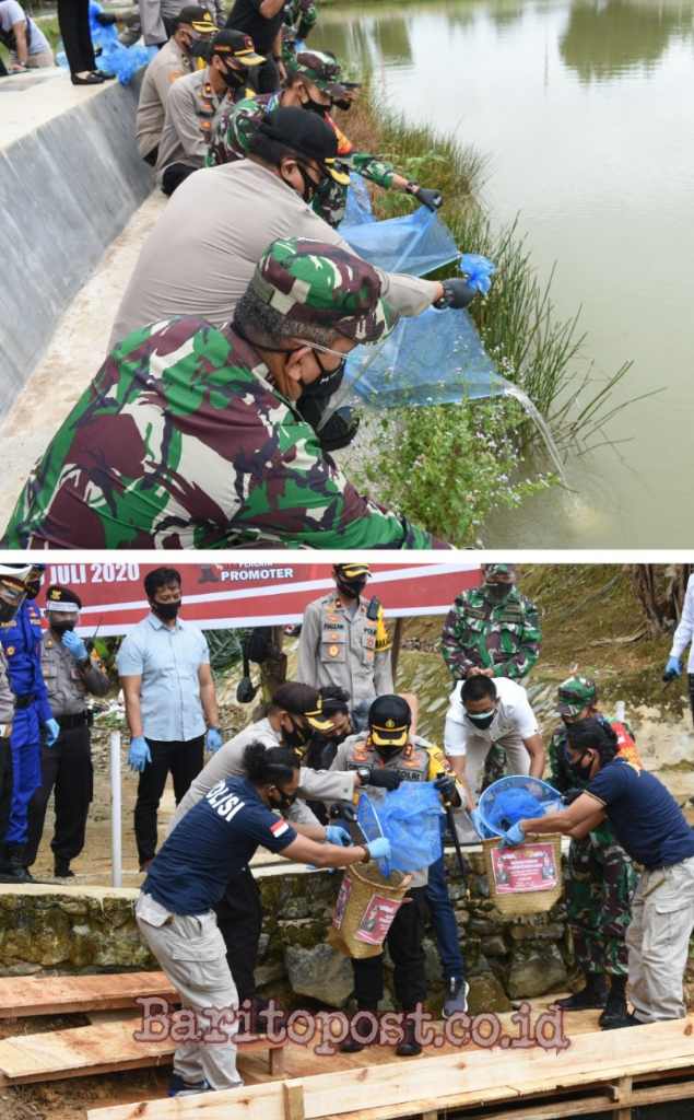 Pelaihari,BARITO – Sinergitas antara TNI Polri dituangkan kedalam kegiatan penebaran ribuan bibit berbagai jenis ikan dikolam ikan Bhayangkara Polres Tala didaerah Matah Kelurahan Karang Taruna dan sekaligus menangkap panen ikan lele Kamis, (9/7).