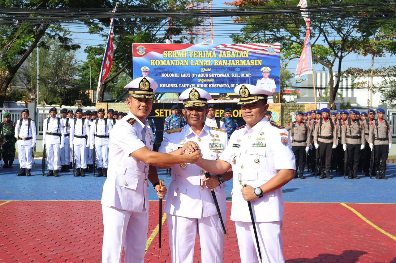 Banjarmasin, BARITOPOST.CO.ID Serah Terima Jabatan (Sertijab) Komandan Pangkalan TNI AL (Danlanal) Banjarmasin dari Kolonel Laut (P) Agus Setyawan, S.H., M.AP., kepada Kolonel Laut (P) Didik Kusyanto, M.Tr.Hanla., digelar di Mako Lanal Banjarmasin Jalan A Yani, KM 3.5, Kecamatan Banjarmasin Timur, Kota Banjarmasin, Kalimantan Selatan, Rabu, (21/8/2024).