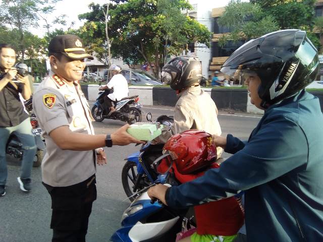 Pengendara yang melintas di Jalan A Yani Km 3,5 arah keluar kota dikejutkan dengan beberapa polisi yang mencegatnya, Sabtu (10/5/2019) sore. Kapolresta Kombes Pol Sumarto pun langsung menyapa pengendara bahwa giat mereka bukan razia motor, melainkan berbagi ratusan takjil.