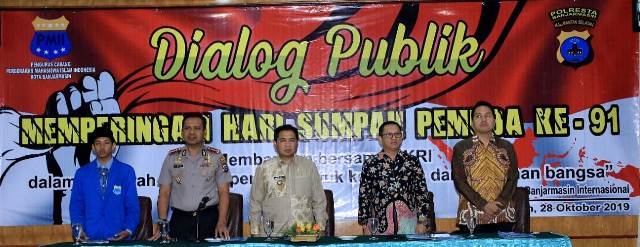 Banjarmasin, BARITO – Dalam rangka memperingati Hari Sumpah Pemuda ke-91, Polresta Banjarmasin bekerjasama dengan Pengurus Cabang (PC) Pergerakan Mahasiswa Islam Indonesia (PMII) setempat menggelar dialog public, Senin (28/10/2019) sekitar pukul 14.00 Wita.