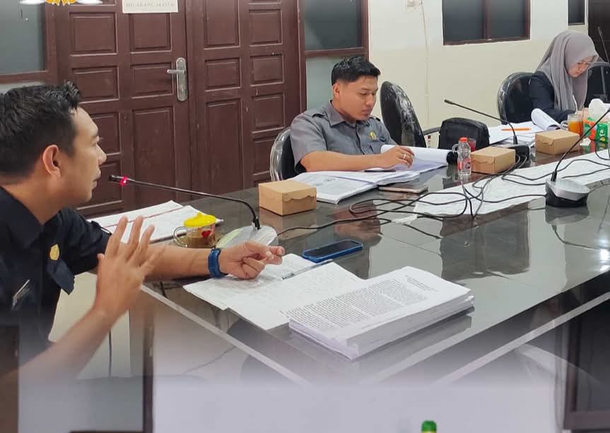 Ketua Komisi I DORD Tala Yoga P Suhendra (Kiri) saat memimpin  Rapat dengan Dinas PMD dan Bagian Hukum Terkait Raperda Bumdes. (Humas DPRD Tala/brt)