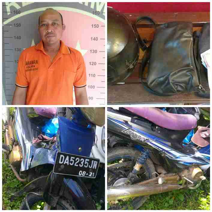 Bahkan barang bukti sepeda motor merk Jialing warna biru hitam dengan nopol DA 5235 JN. Termasuk satu helm warna hitam dan satu lembar kaos lengan panjang warna hitam menjadi bukti saat tersangka ini beraksi.