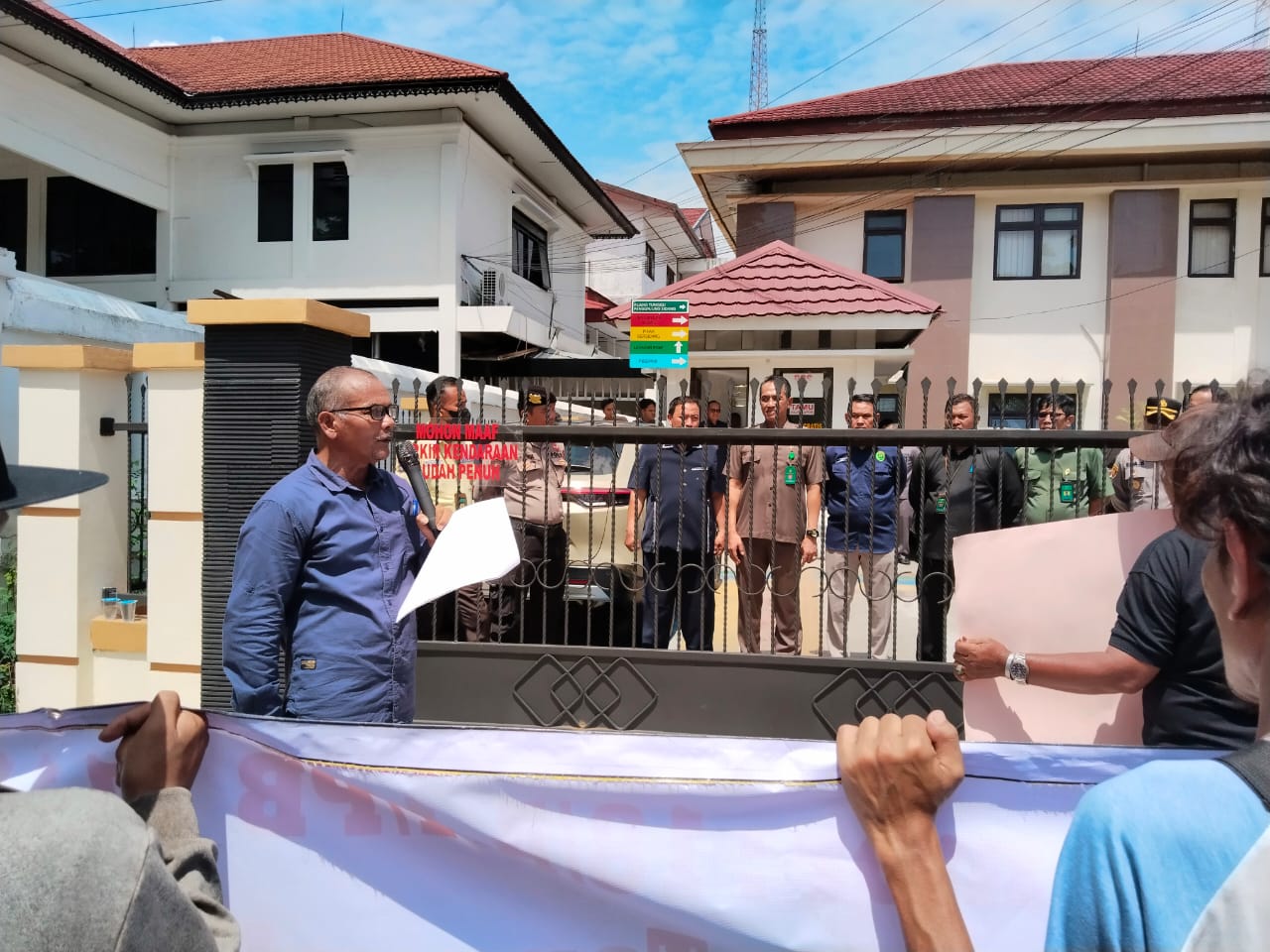 Banjarmasin, BARITOPOST.CO.ID – Korban dugaan Mafia Tanah Sojuangun Hutauruk membawa massa menggelar aksi demo di depan Pengadilan Negeri (PN) Banjarmasin, Rabu (9/10/2024) pagi. Dengan orasi seorang diri dikerumuni warga yang membawa poster, suami Erni Rosemery itu memprotes pertimbangan vonis hakim yang mengacu pada pertimbangan diduga fiktif.