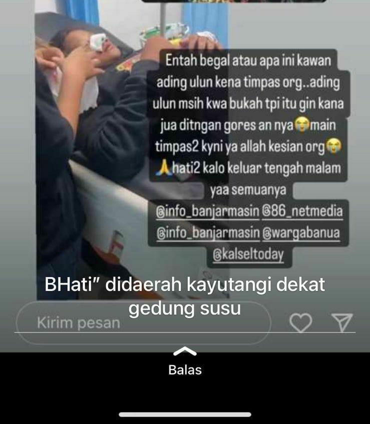 Korban kemudian dibawa ke rumah sakit terdekat untuk mendapat perawatan. Sementara pada foto korban ada komentar sang kakak di medsos yang menyatakan, adiknya entah begal atau apa ini yang terjadi di kawasan Kayutangi.